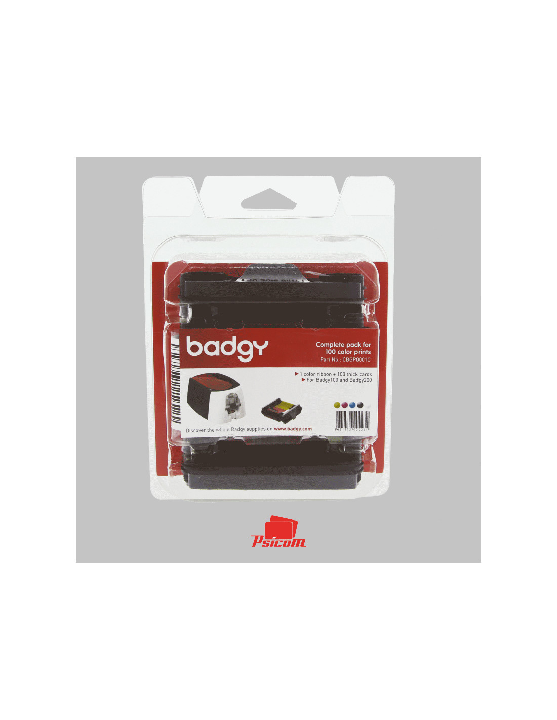Pack Badgy 200 tout-en-un, comprenant un ruban couleur YMCKO et 100 cartes PVC en format CB (épaisseur 0.76 mm).