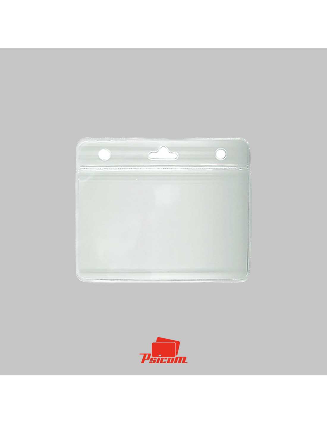 Référence : PSICA009 - Porte-badge souple en vinyle transparent - Modèle horizontal - Pour carte 86 x 54 mm de 0,2 à 0,76 mm - Bandeau renforcé - Perforation oblongue pour clip et ronde pour chaînette et cordon - conditionnement par 100 - poids : 2,5 gr.
