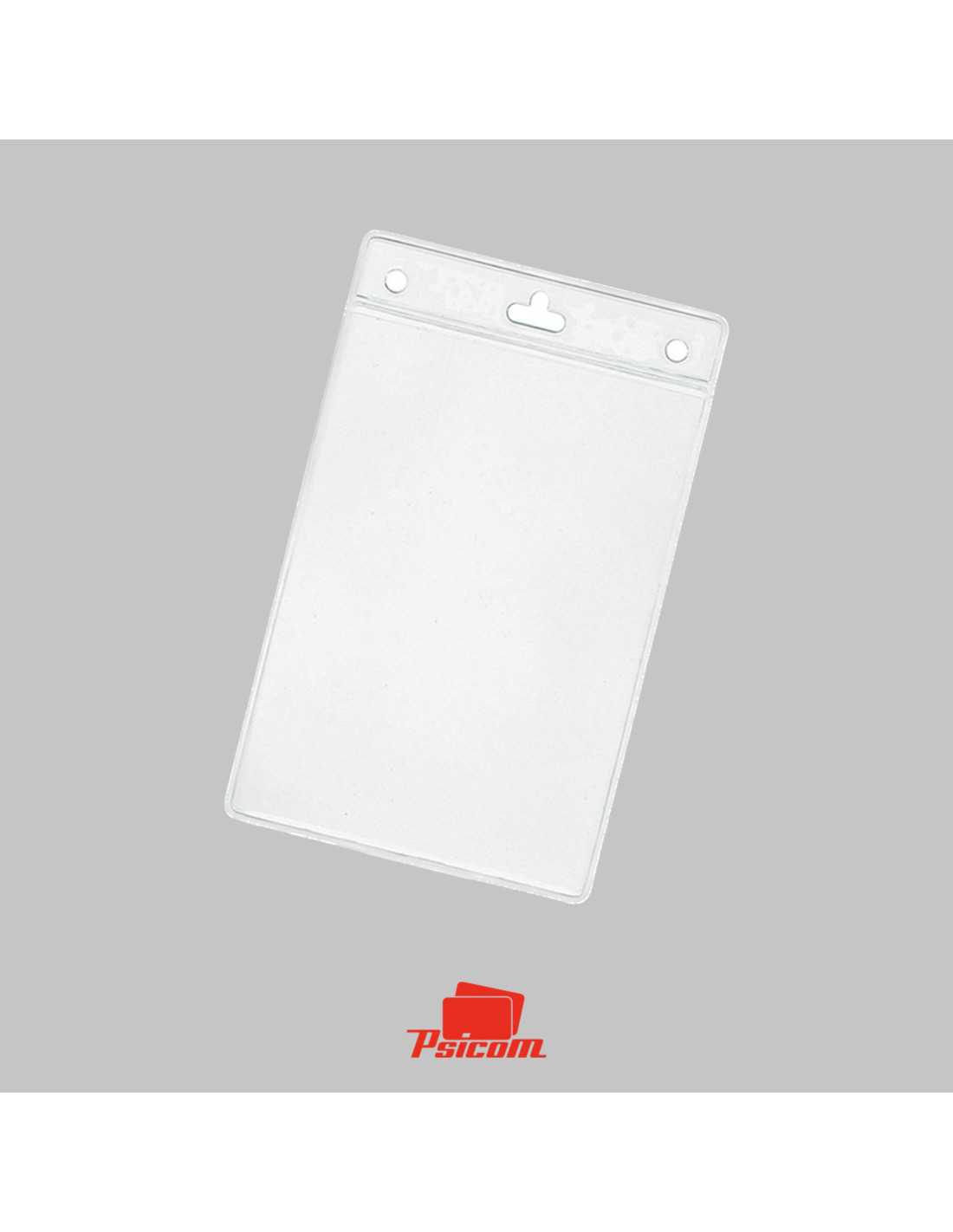 Référence : PSICA010 - Porte-badge souple en vinyle transparent - Modèle vertical - Pour carte 86 x 54 mm de 0,2 à 0,76 mm - Bandeau renforcé - Perforation oblongue pour clip et ronde pour chaînette et cordon - conditionnement par 100 - poids : 2,5 gr.