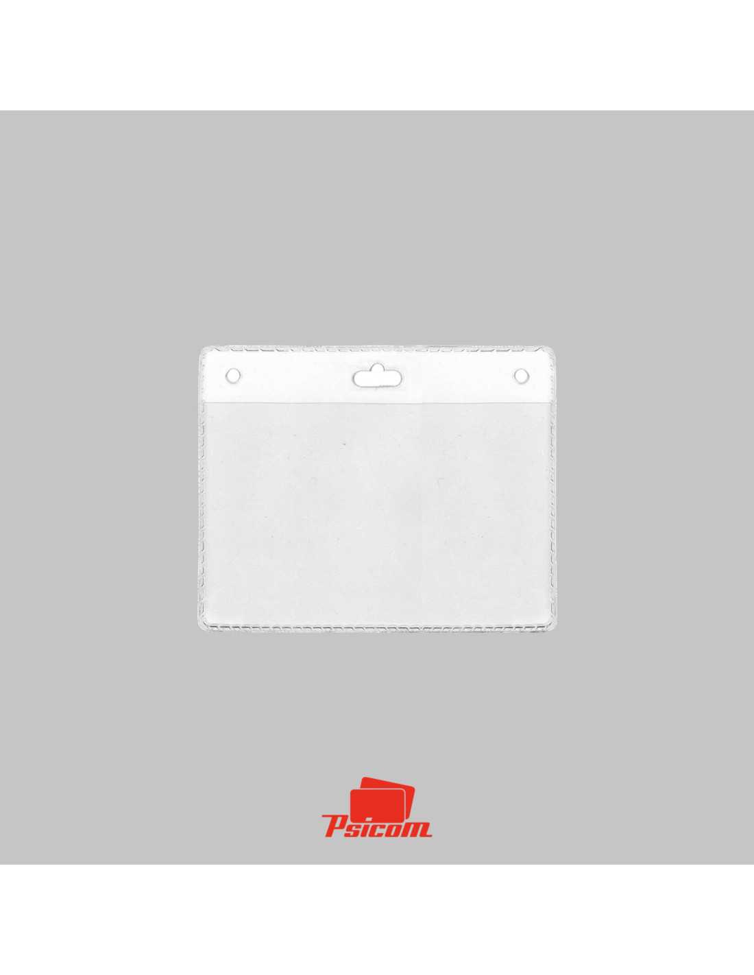 Référence : PSICA047 - Porte-badge souple en vinyle transparent - Modèle horizontal - Pour carte 105 x 75 mm de 0,2 à 0,76 mm -Perforation oblongue pour clip et ronde pour chaînette et cordon - conditionnement par 100 - poids : 4,32 gr.