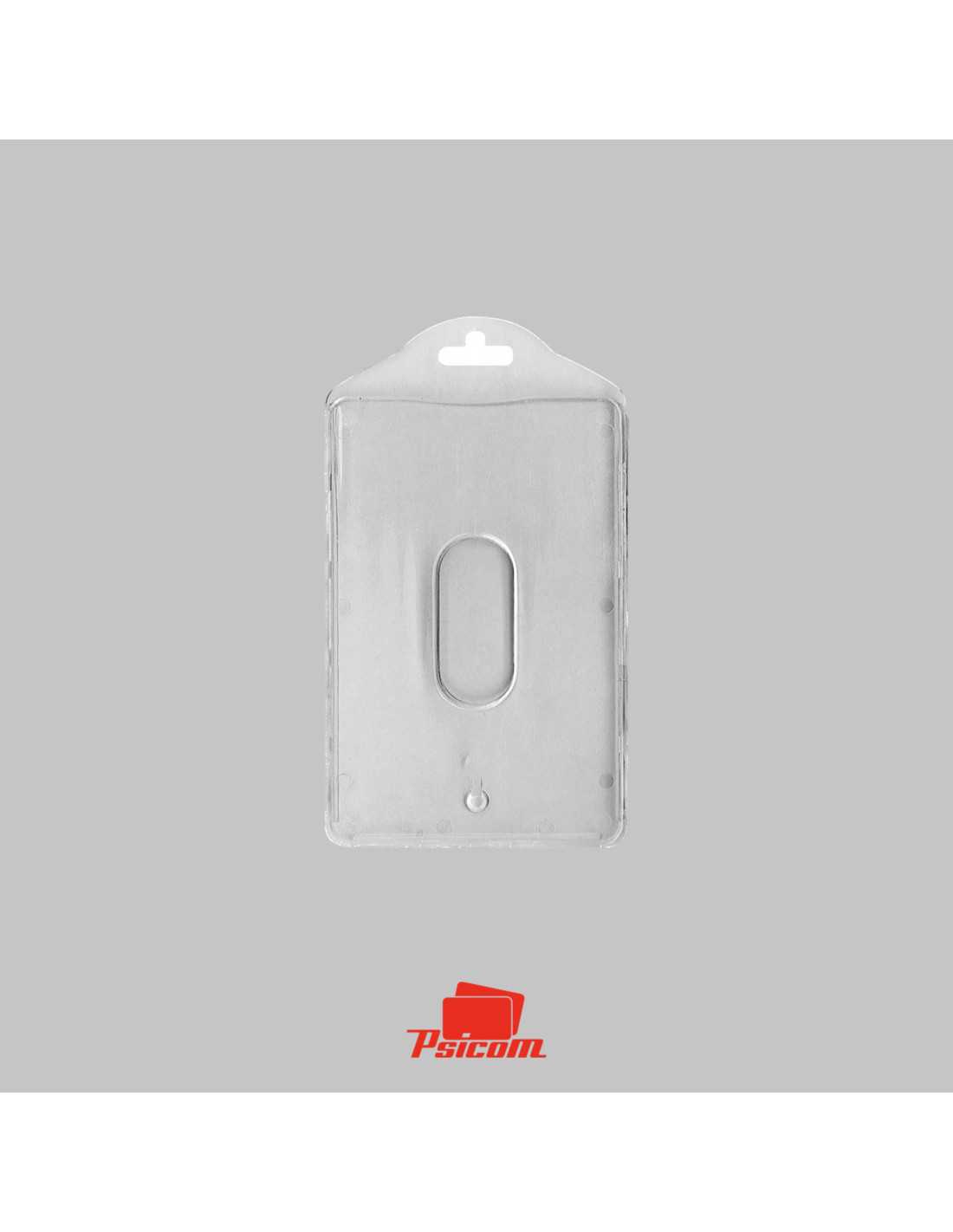 Référence : PSICA2CV - Porte-badge rigide en polycarbonate traité anti UV - Pour 2 cartes 86 x 54 mm, 0,76 mm d'épaisseur avec séparation - Modèle vertical - Perforation européenne - Conditionné par 100 - Poids : 15 gr.