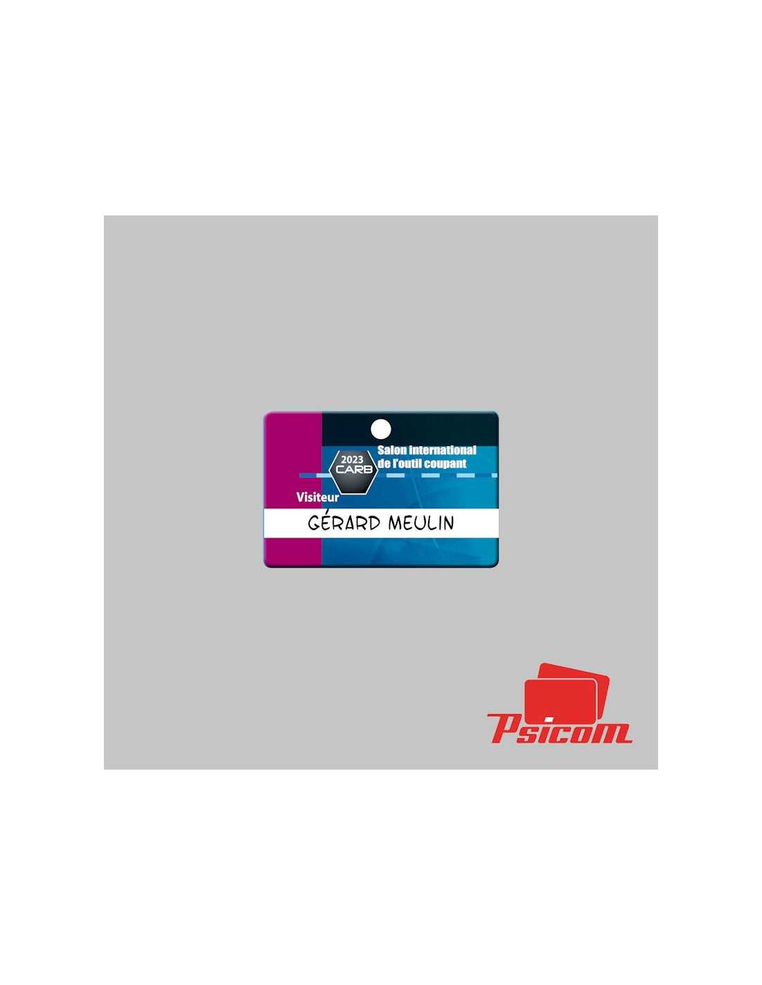 Badge plastique salon ou séminaire - Plusieurs formats disponibles - Ep. 0,65 mm - laminage brillant - Impression couleur 2 faces - Polyester sans chlore et recyclable