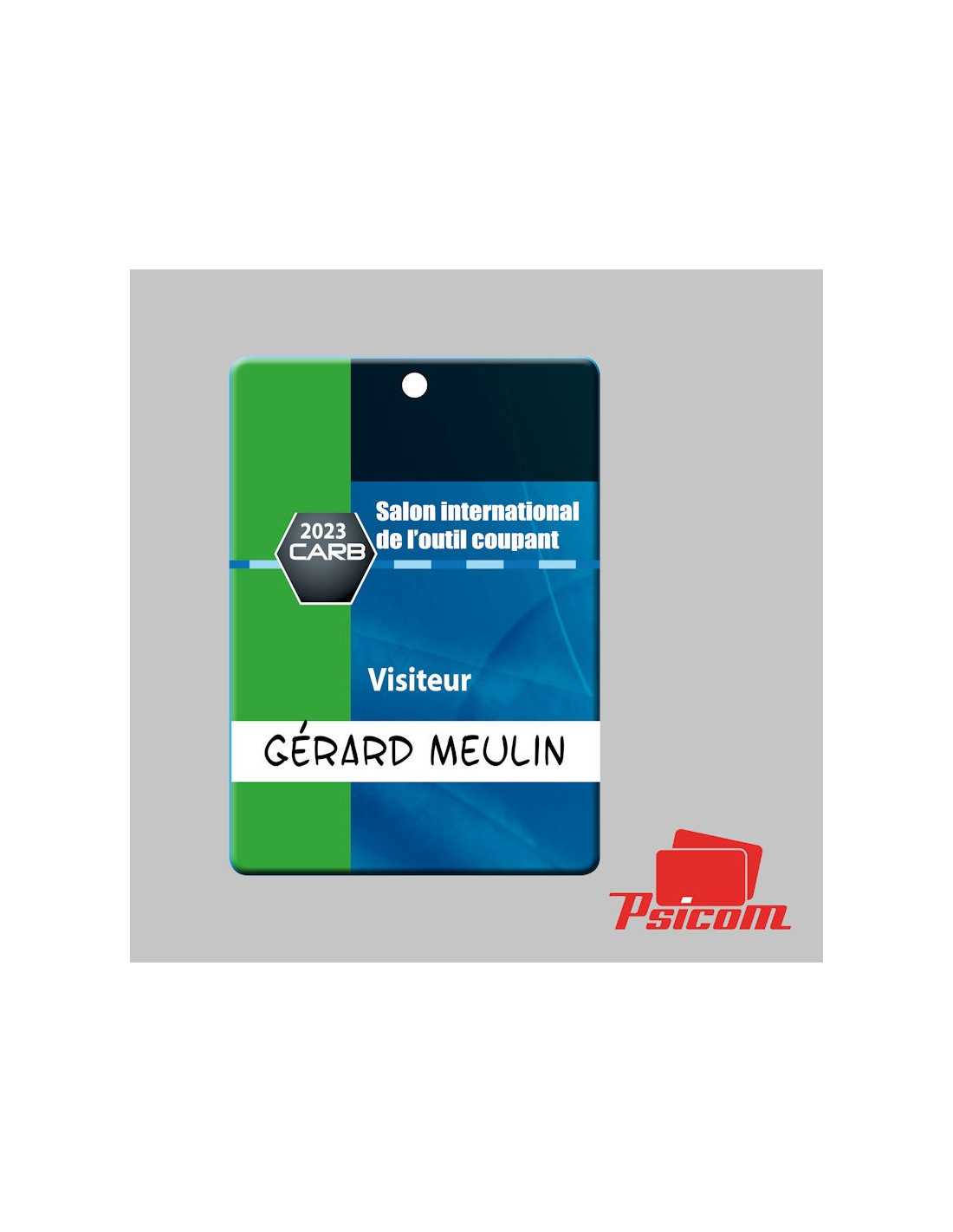 Badge plastique salon ou séminaire - Plusieurs formats disponibles - Ep. 0,65 mm - laminage brillant - Impression couleur 2 faces -  Polyester sans chlore et recyclable