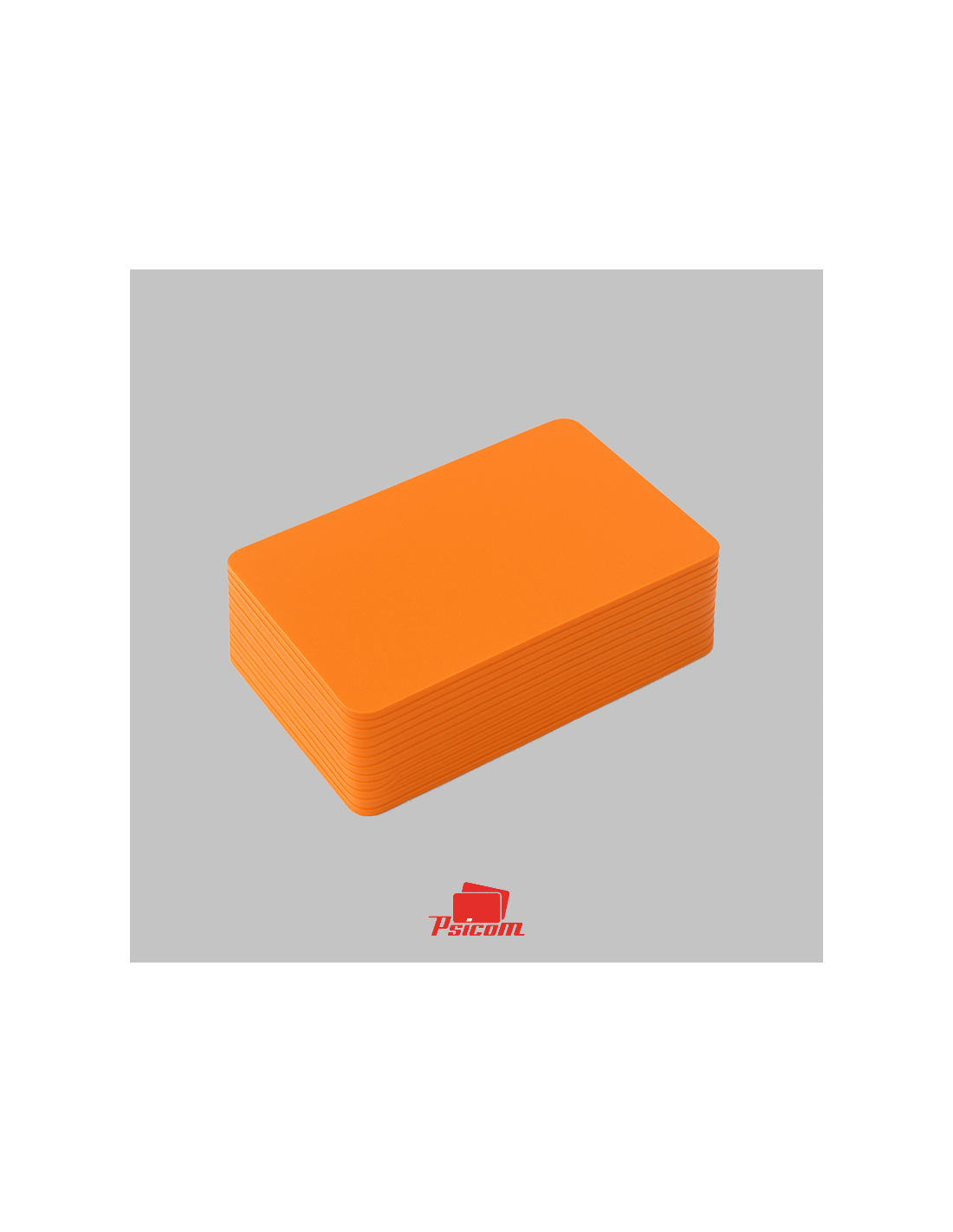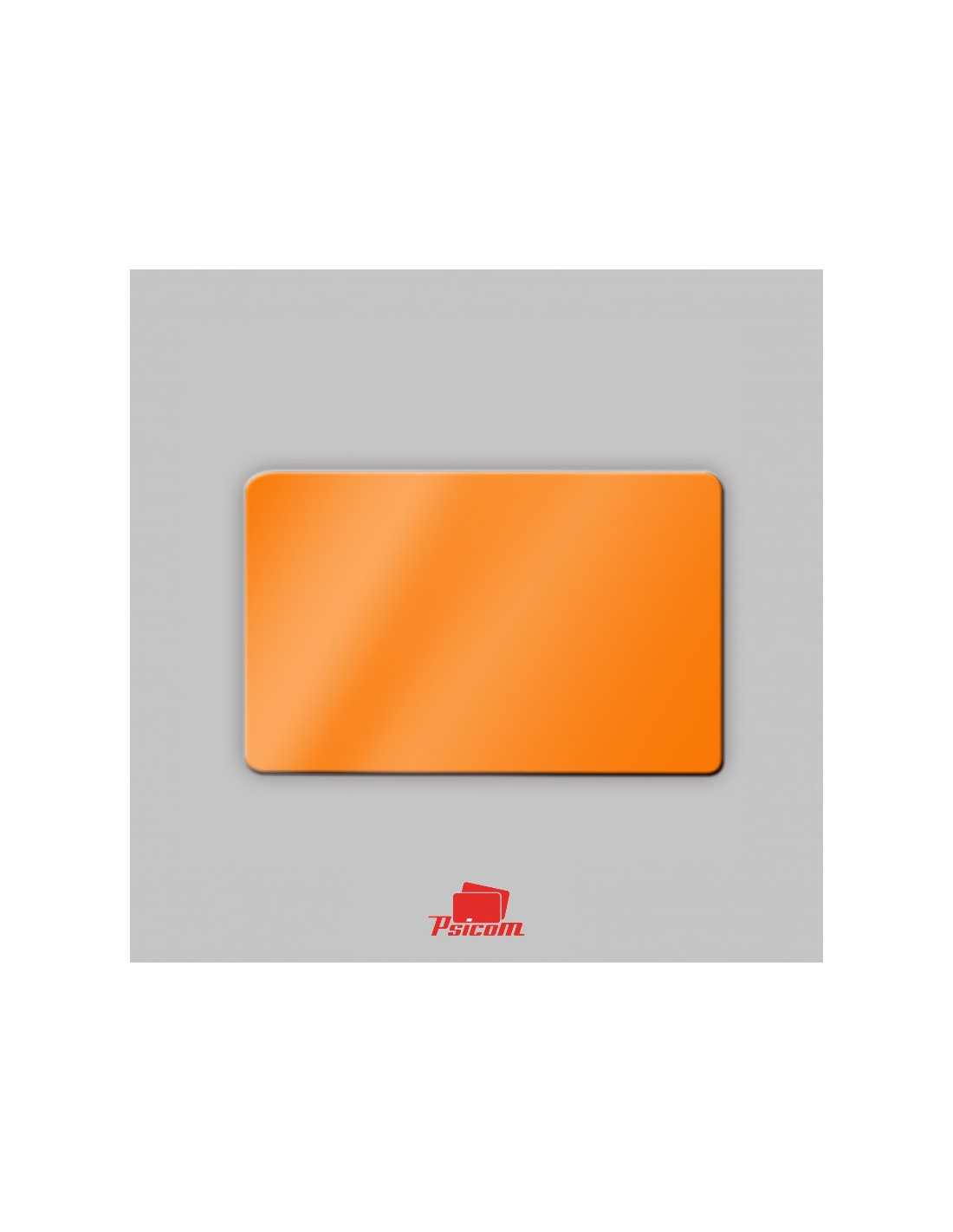 Référence : PSICV014 - Carte PVC laminé 0,76 mm, format 86 x 54 mm, coins arrondis, fond orange, R° V°, teintée dans la masse.