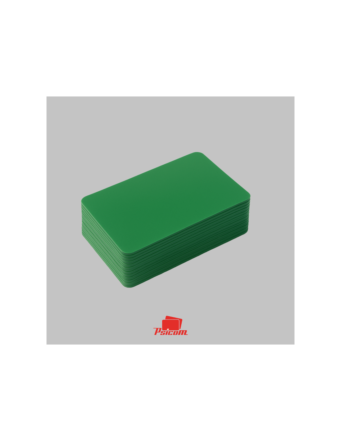 Référence : PSICV015 - Carte PVC laminé 0,76 mm, format 86 x 54 mm, coins arrondis, fond vert, R° V°, teintée dans la masse.