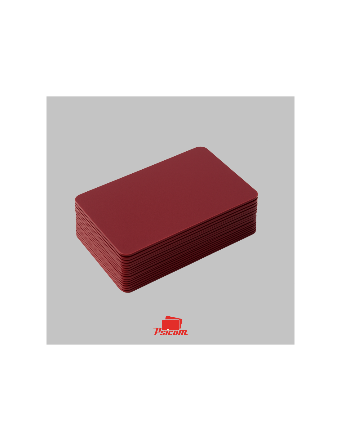 Référence : PSICV025 - Carte PVC laminé 0,76 mm, format 86 x 54 mm, coins arrondis, fond bordeaux brillant, R° V°, teintée dans la masse.