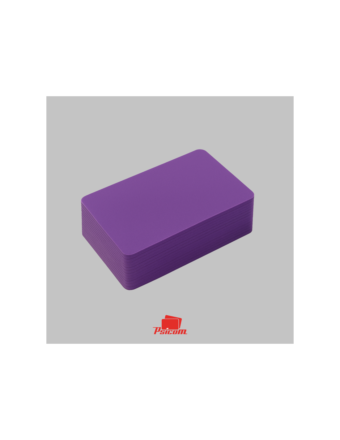 Référence : PSICV026 - Carte PVC laminé 0,76 mm, format 86 x 54 mm, coins arrondis, fond violet brillant, R° V°, teintée dans la masse.