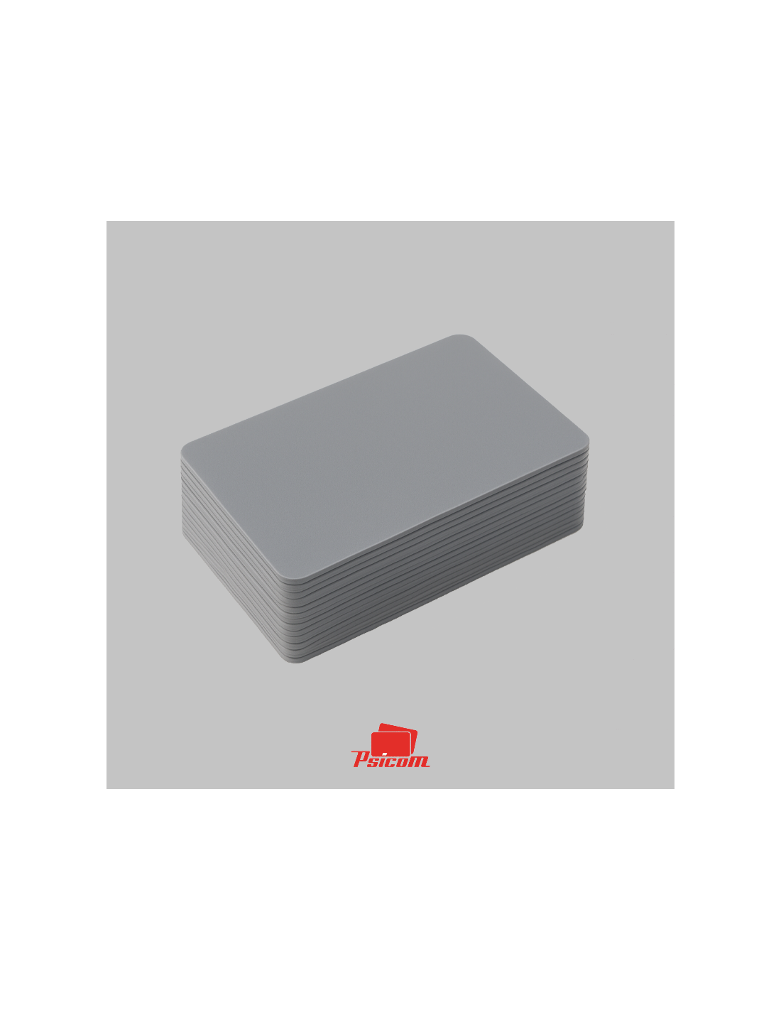 Référence : PSICV030 - Carte PVC laminé 0,76 mm, format 86 x 54 mm, coins arrondis, fond gris mat, R° V°, teintée dans la masse.