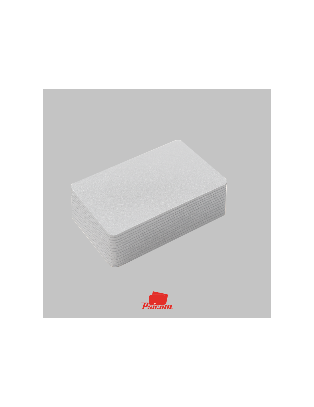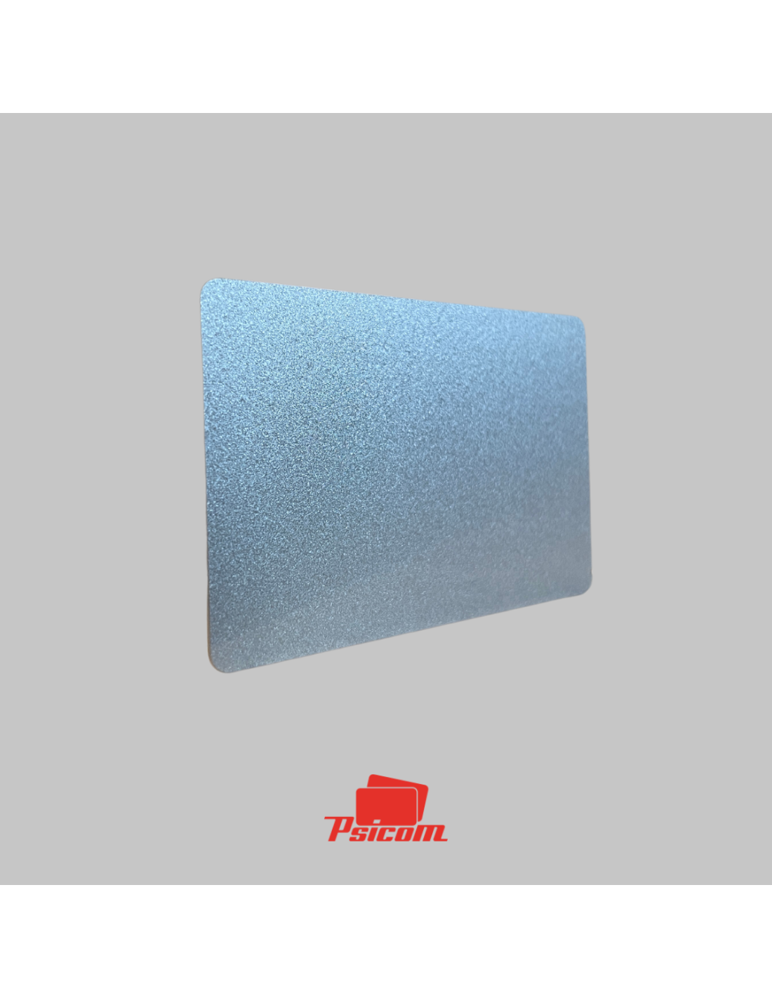 Référence : PSICV023 - Carte PVC laminé 0,76 mm, format 86 x 54 mm, coins arrondis, fond argent pailleté, R° V°.